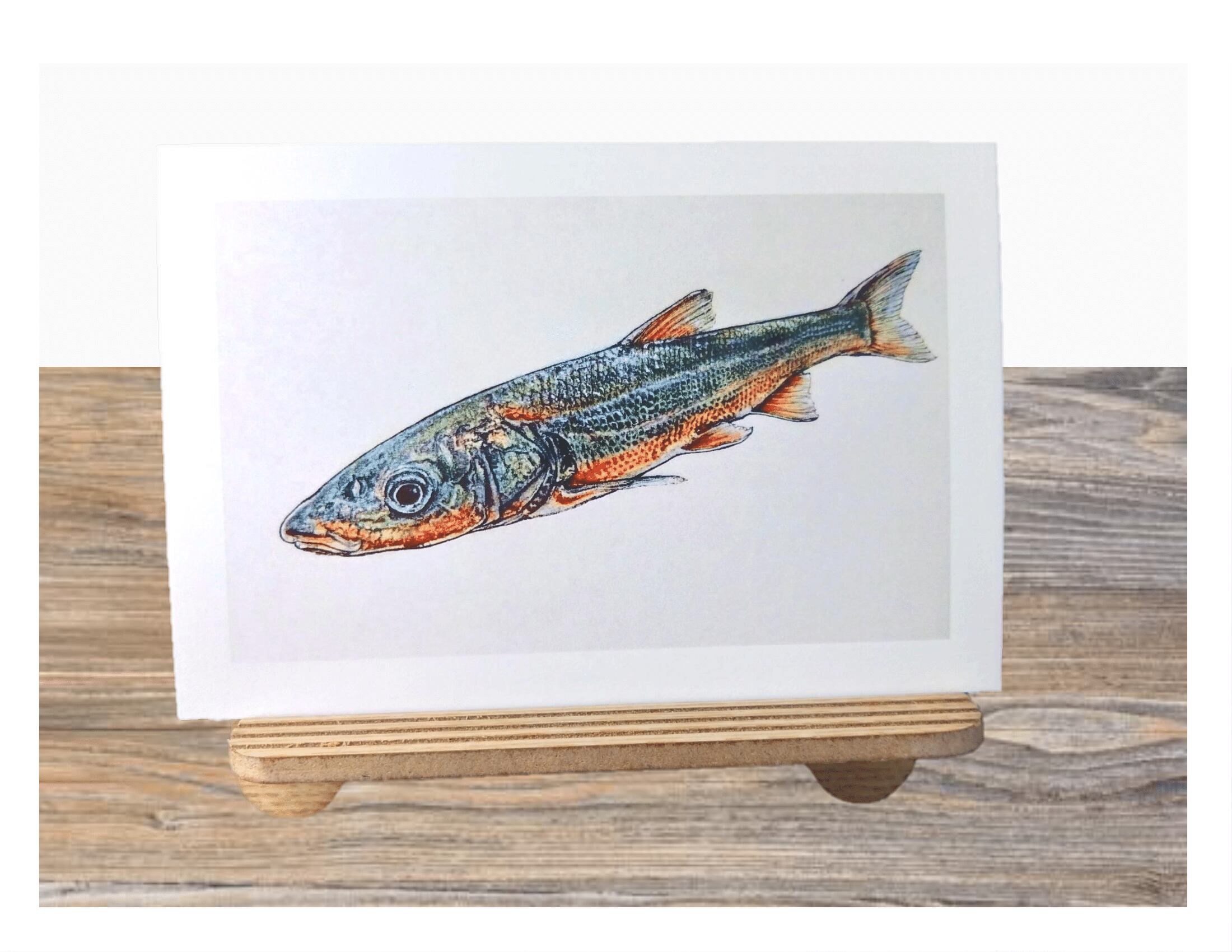 「魚…ですか?『ウグイ』ポストカード」です。朱色の婚姻色を纏い、スマートな体つきが美しい日本の淡水魚ウグイを、ペン、色鉛筆、透明水彩絵具で繊細に描き上げました。