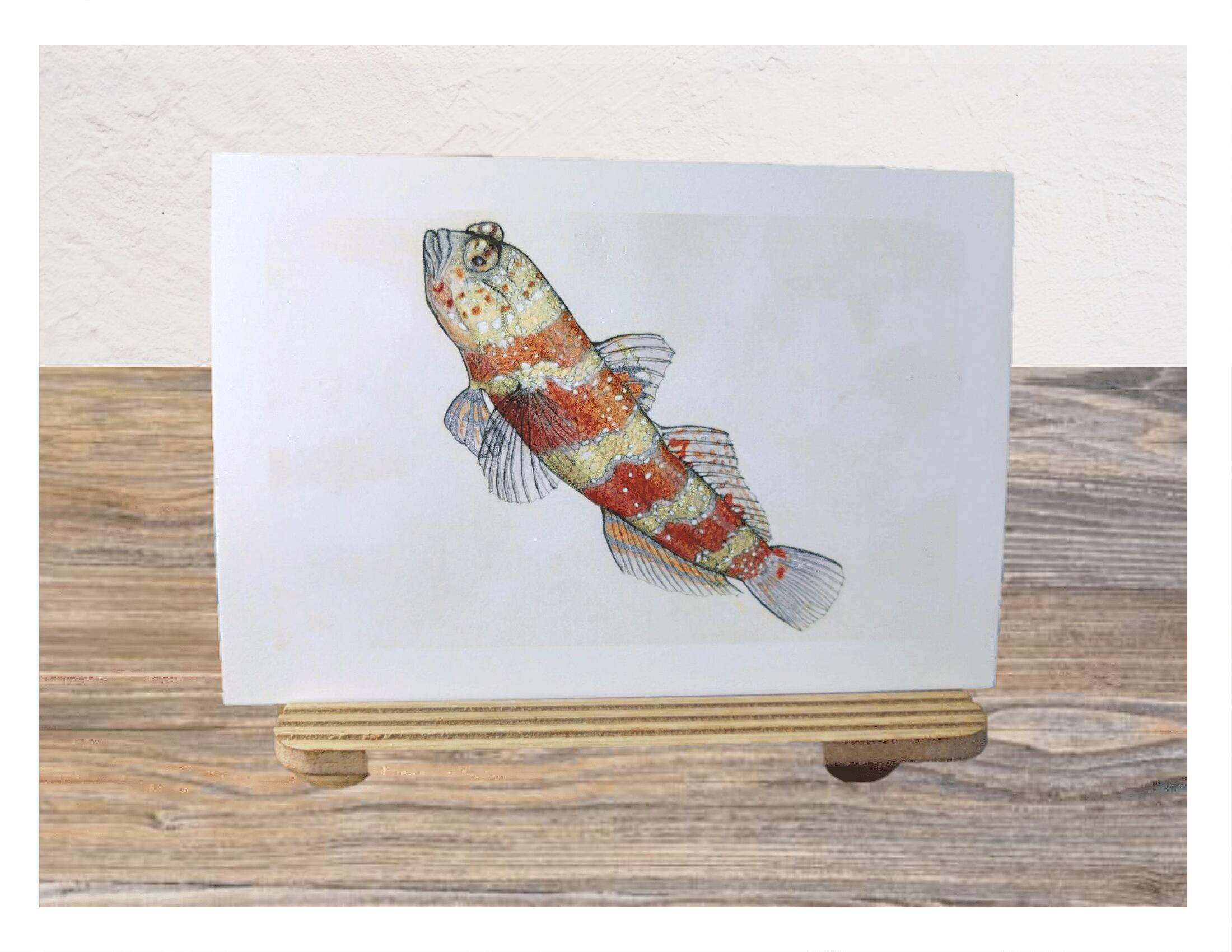 「魚…ですか?『クビアカハゼ』ポストカード」です。サンゴ礁に生息する、赤と薄い黄色が美しく彩る派手な魚、クビアカハゼを、ペン、色鉛筆、透明水彩絵具で繊細に描き上げました。その色鮮やかな身と特徴を活かし、見る者を惹きつける一枚に仕上げています。