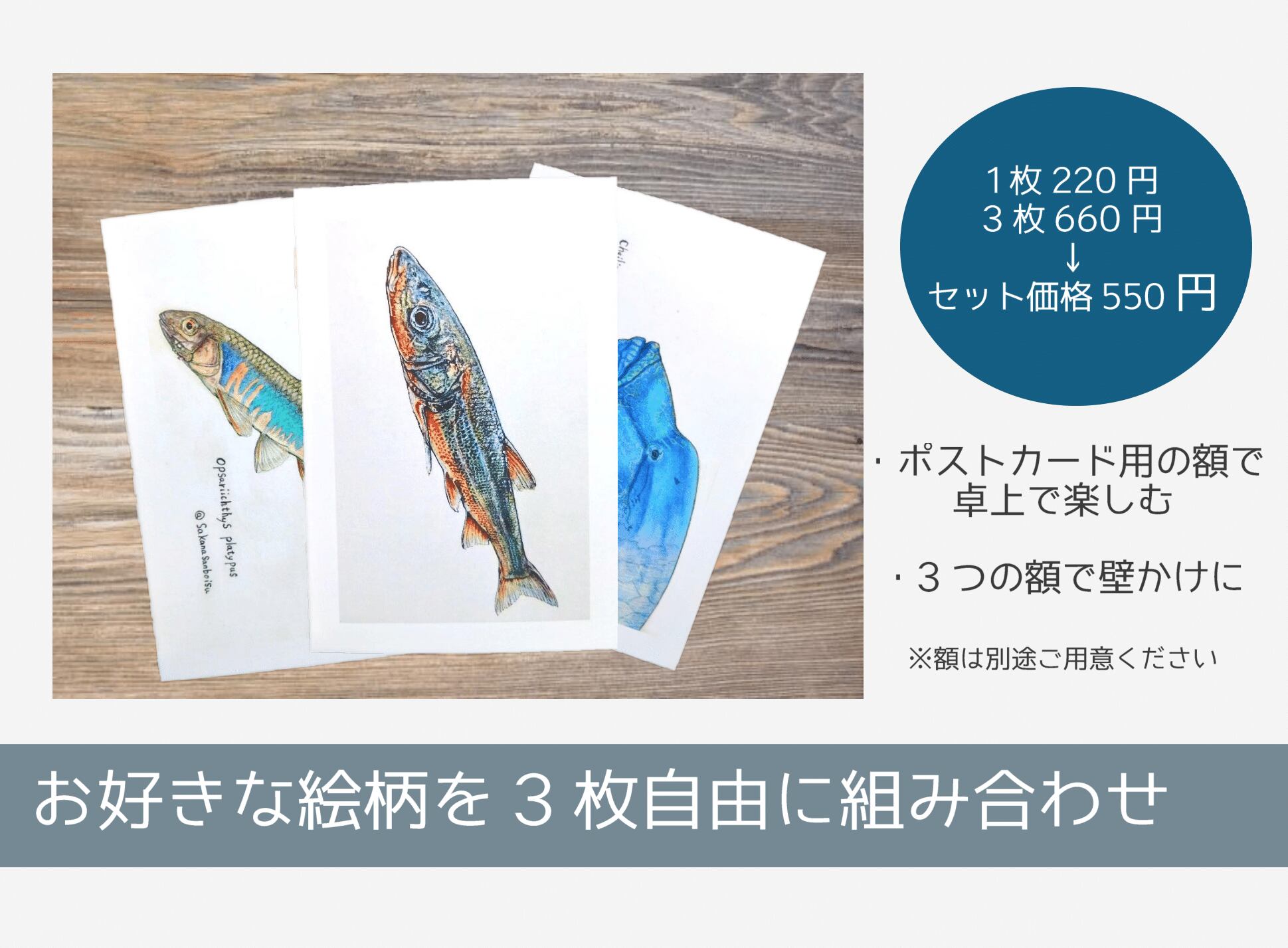 「魚…ですか?ポストカード3枚セット」です。多彩な魚たちをテーマにしたポストカードを3枚、自由な組み合わせでお選びいただけます。通常価格660円(税込)が、550円(税込)でお求めいただけるお得なセットです。全て同じ絵柄を選んでも、全て違う絵柄を選んでも、気に入った絵柄を多めに選んでも大丈夫です。