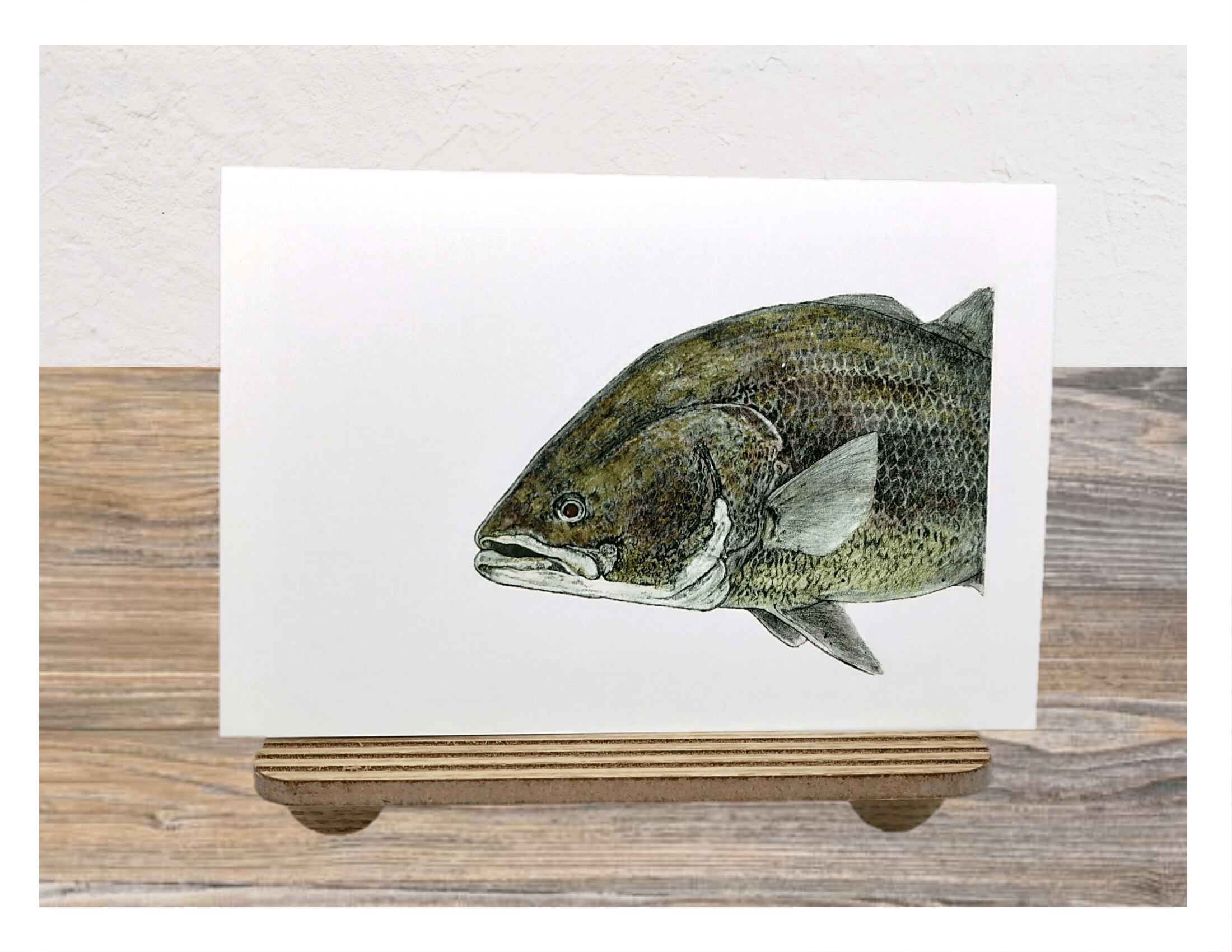 「魚…ですか?『アカメ』ポストカード」です。存在感のある身体と特徴的な赤い目を持つアカメを、ペン、色鉛筆、透明水彩絵の具で描きあげた美しいイラストを使用したポストカードです。