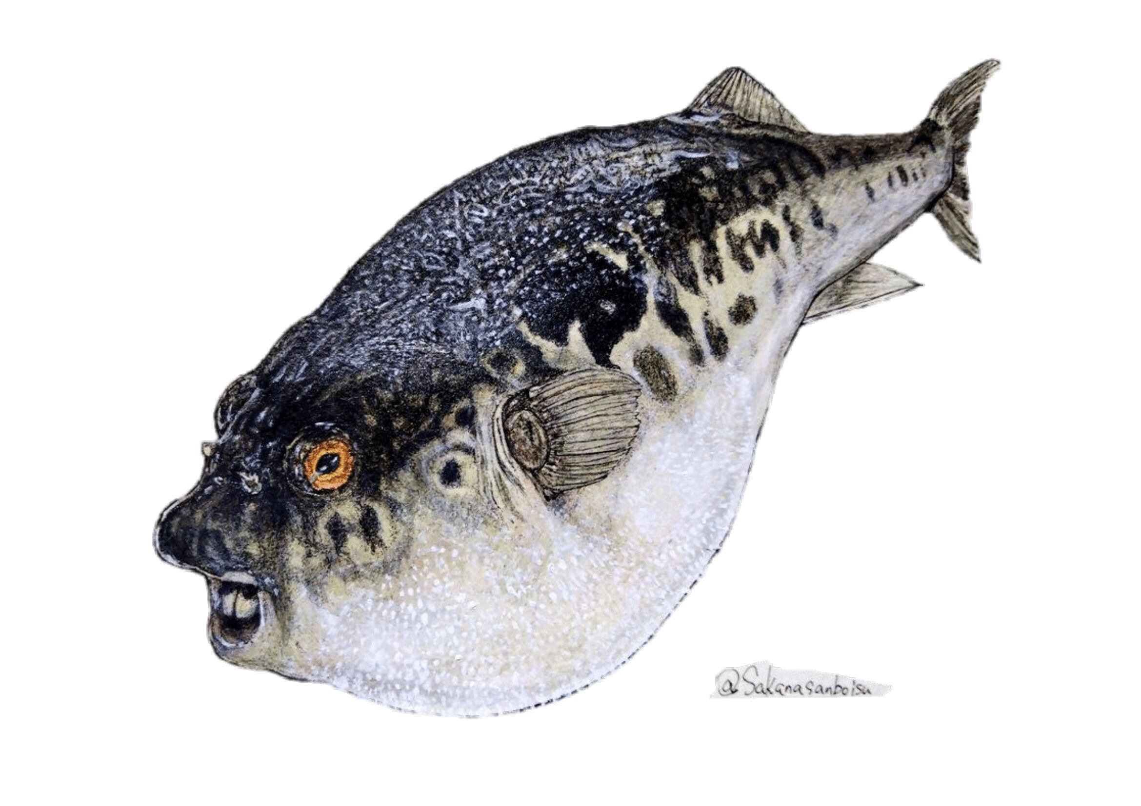 トラフグ(Takifugu rubripes)を、鱗の質感や体表の微細な模様まで細密に描写した原画作品です。
